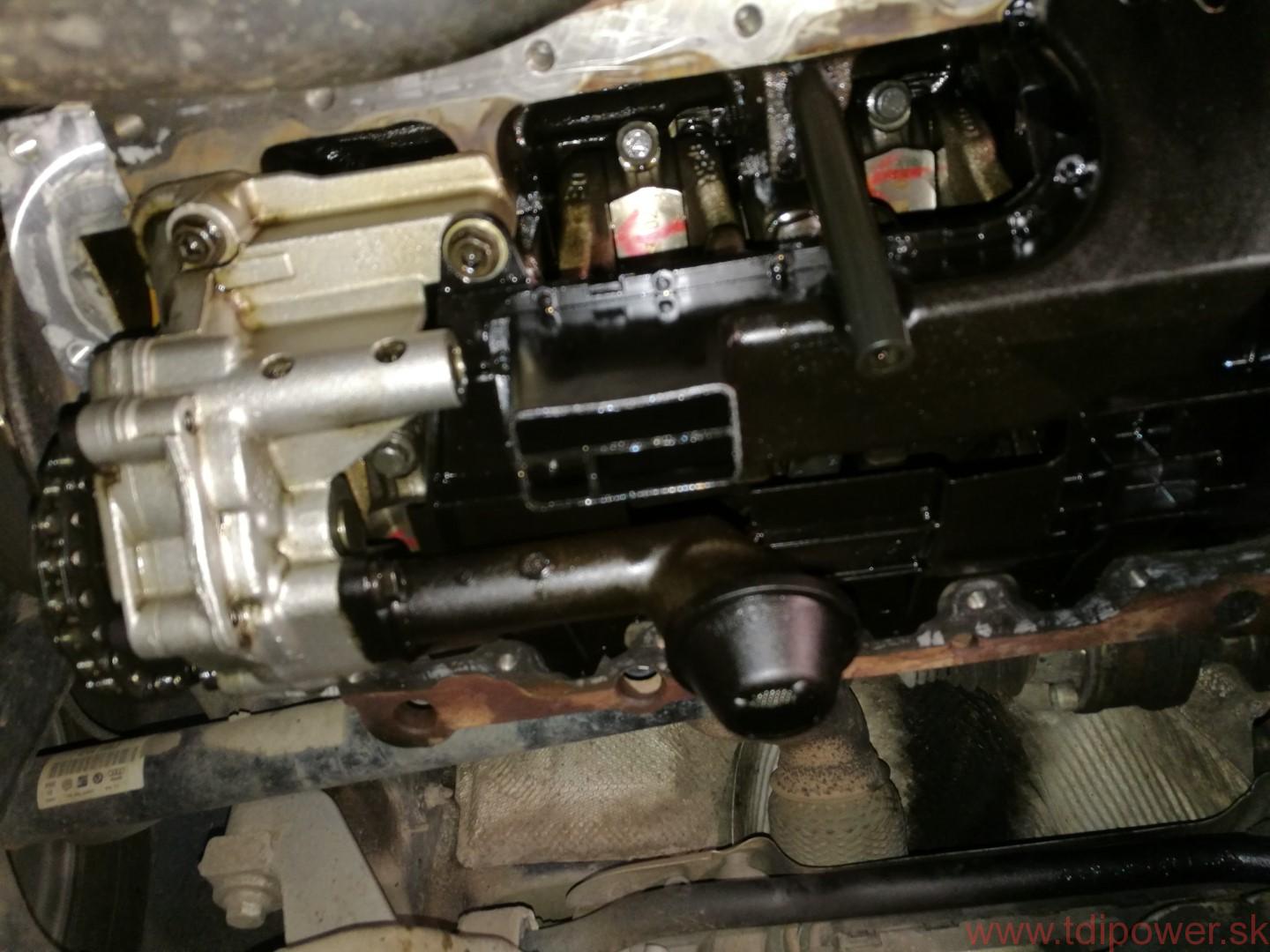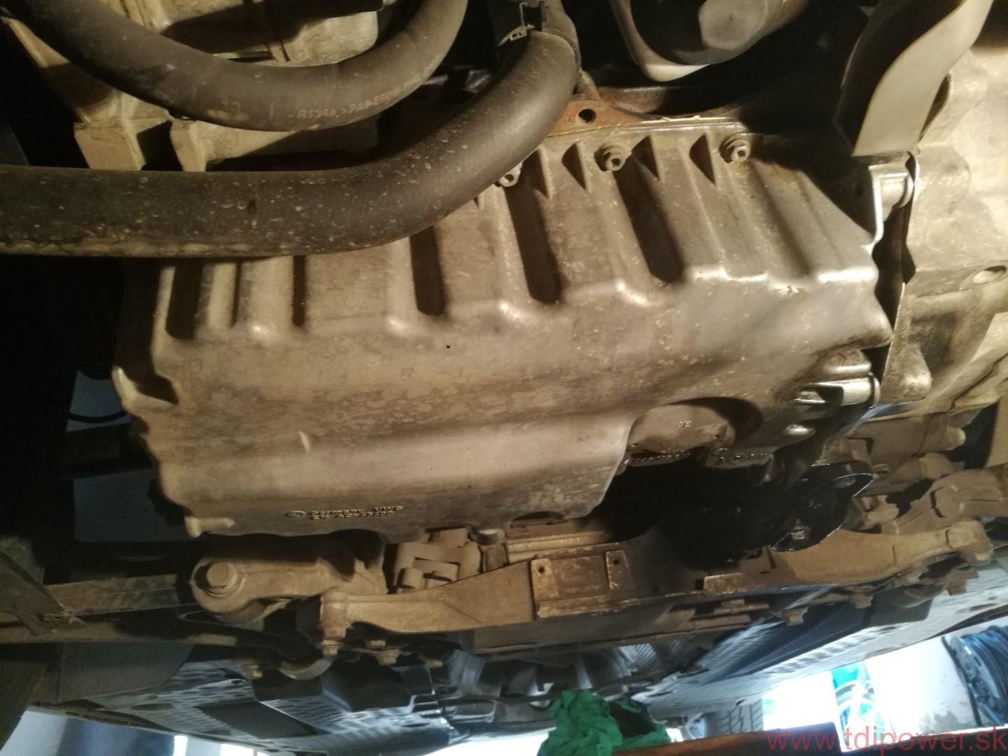 V prvom rade vypustíme olej z motora, a začneme demontovať olejovú vaňu. Dve skrutky olejovej vane pri zotrvačníku sú problematické, musíte motor natočiť tak aby sa Vám ukázal výsek na zotrvačníku pre lepší prístup ku skrutkám.. Mne sa pri demontáži osvedčil imbus s guľatou hlavou na konci. Nedá sa k tým skrutkám dostať kolmo. Demontujte všetky skrutky imbus č.5, demontujte aj 3 skrutky čo idú z prevodovky veľkosť č.16., plastový držák hadice do IC. Jemným poklepom gumovým kladivom pôjde vaňa dolu.