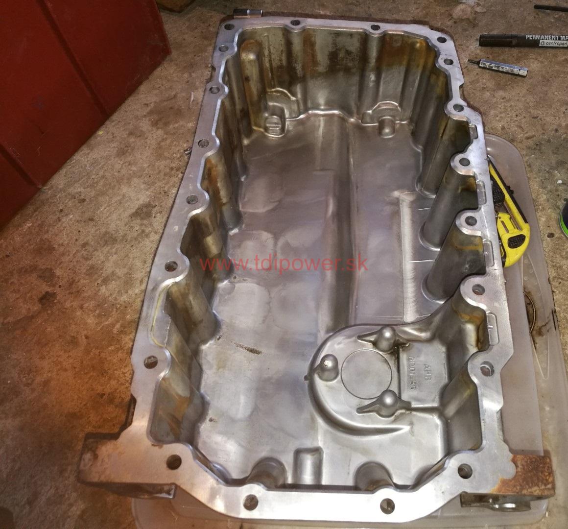 Jestvujúce zvyšky tesniaceho tmelu oškriabeme, vyčistíme a odmastíme. Pripravíme olejovú vaňu na tmelenie a montáž.