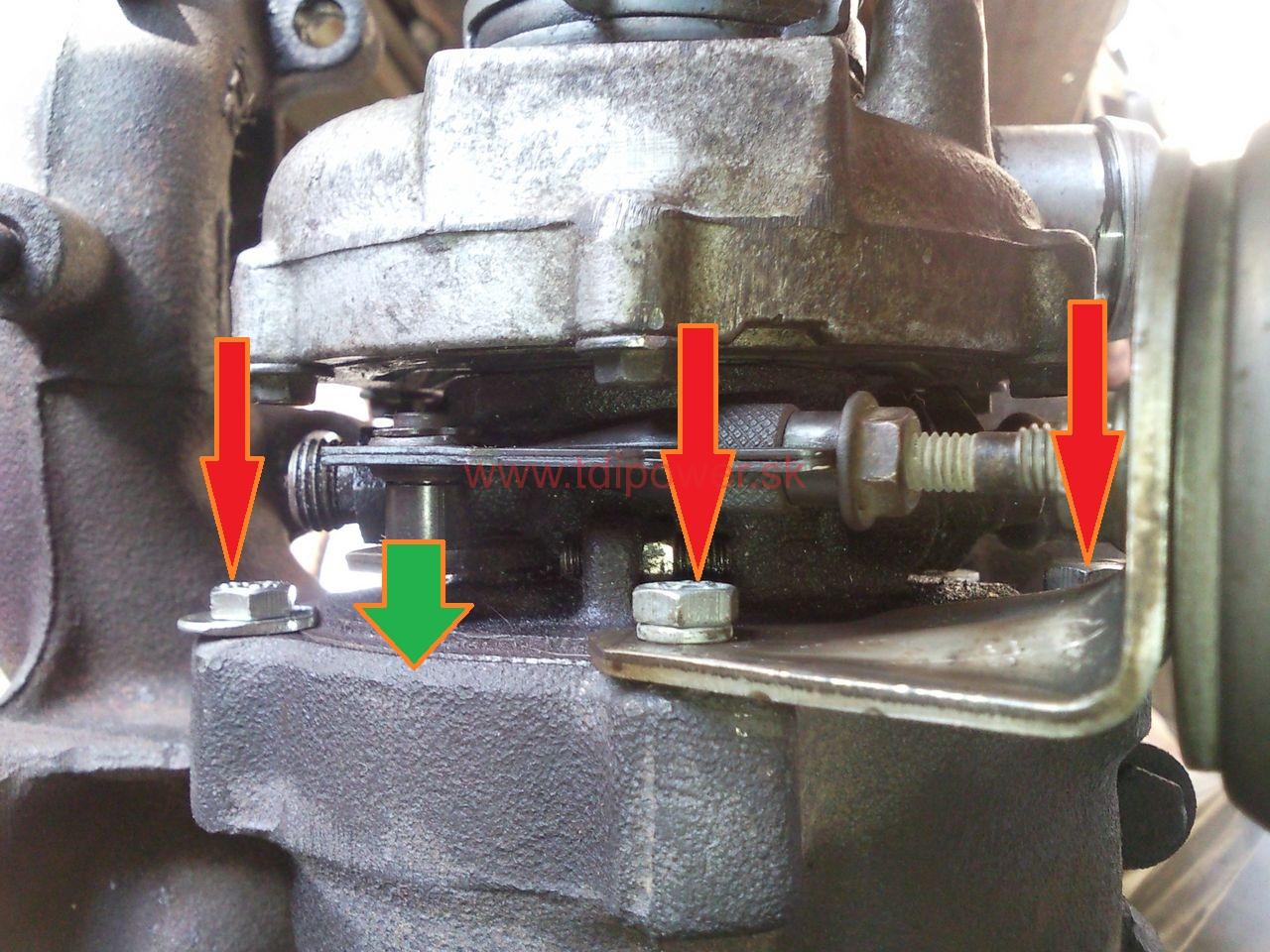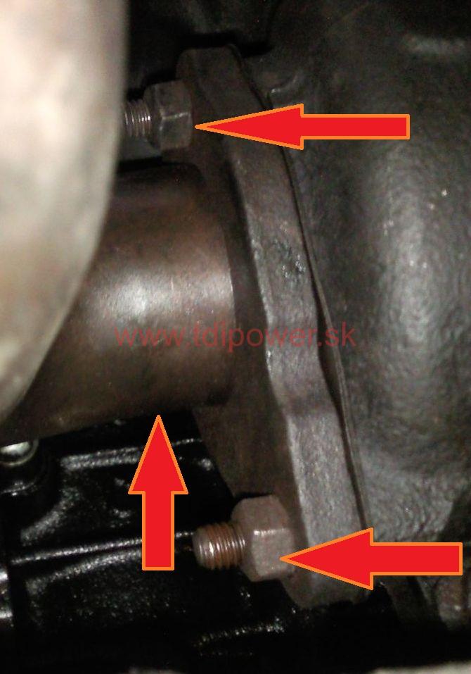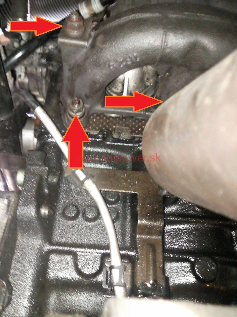Od spodu odkrútime 3 matky výstupu do výfukového potrubia a odtiahneme smerom do ľava aby sme potom turbo mohli vybrať smerom do hora. Oddelenú časť priviažeme – nemala by veľmi prevísať