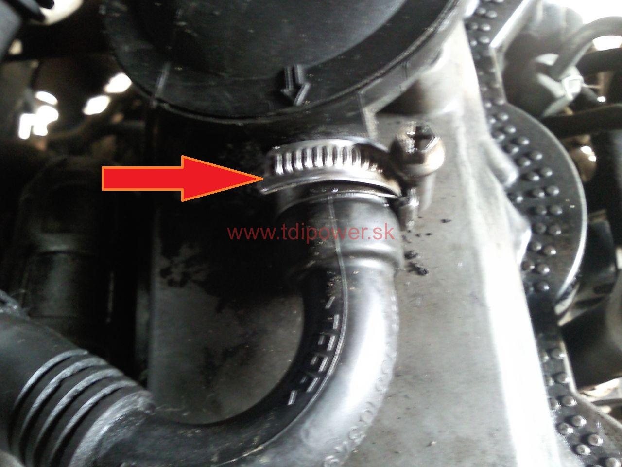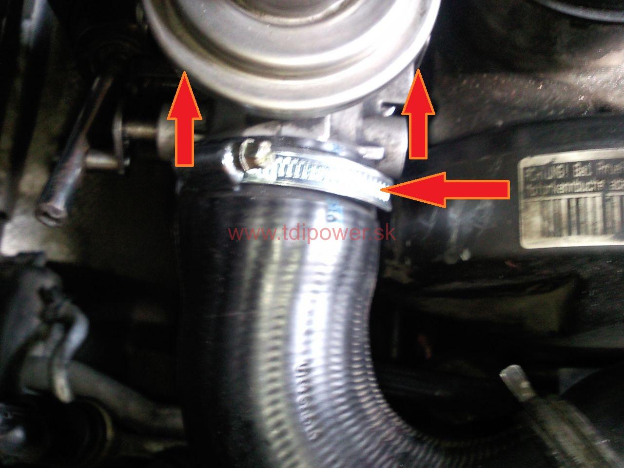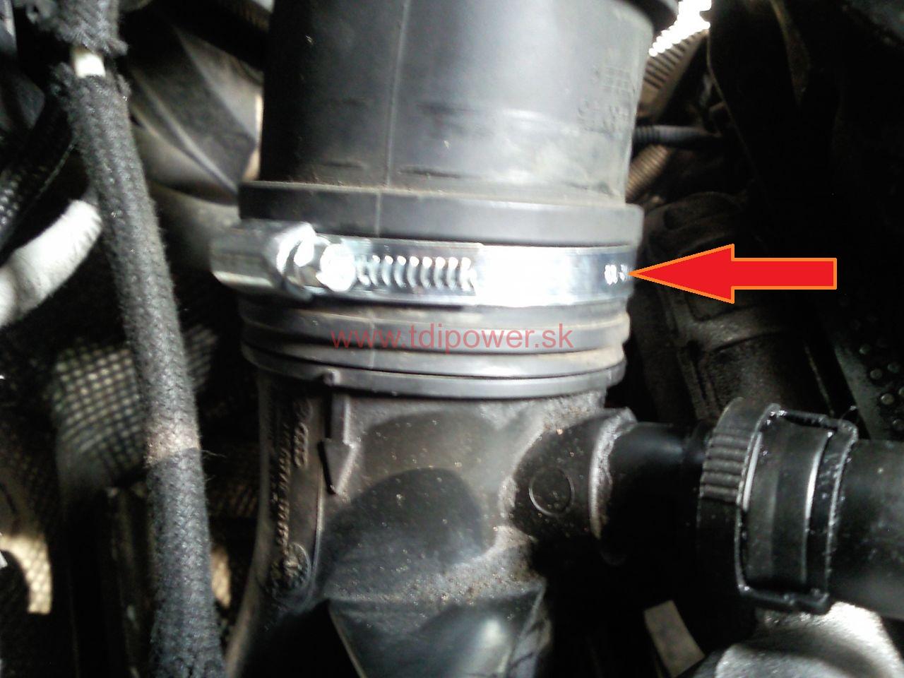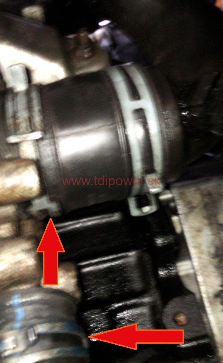 Zo spodu po stlaceni pruzných spojek odmontujeme prívod vzduchu do turba a výstup do inercooleru.