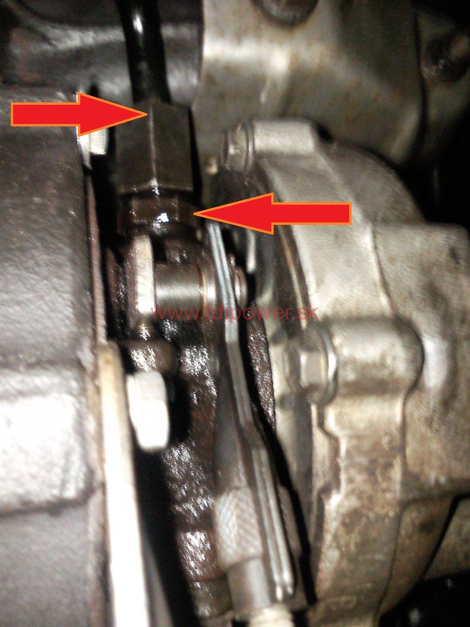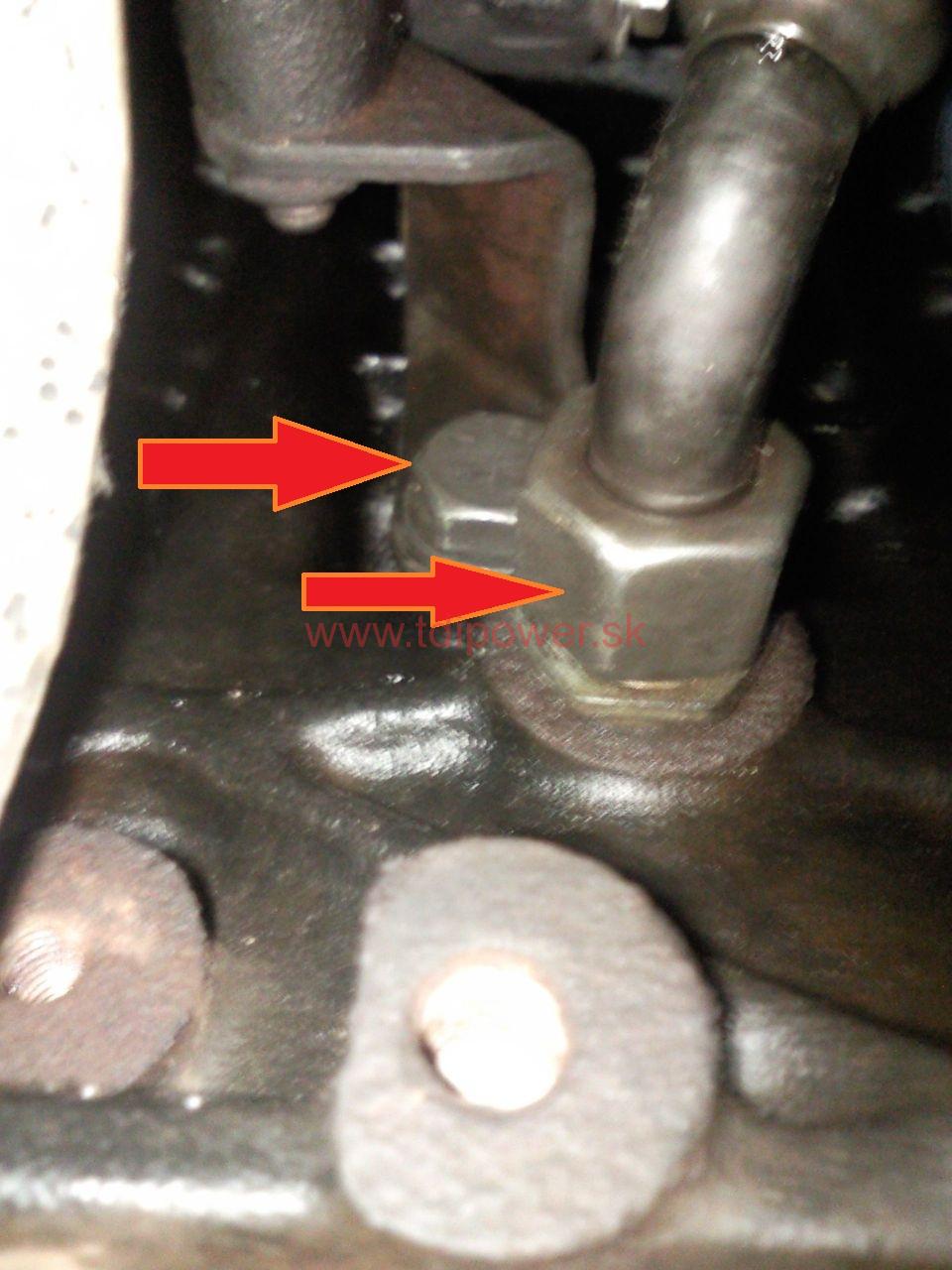 Zo spodu odkrútime prevlečnú maticu spätnej vetvy mazania turba – oleja je tam len trochu, odkrútime 17-ku skrutku držiacu spodok turba