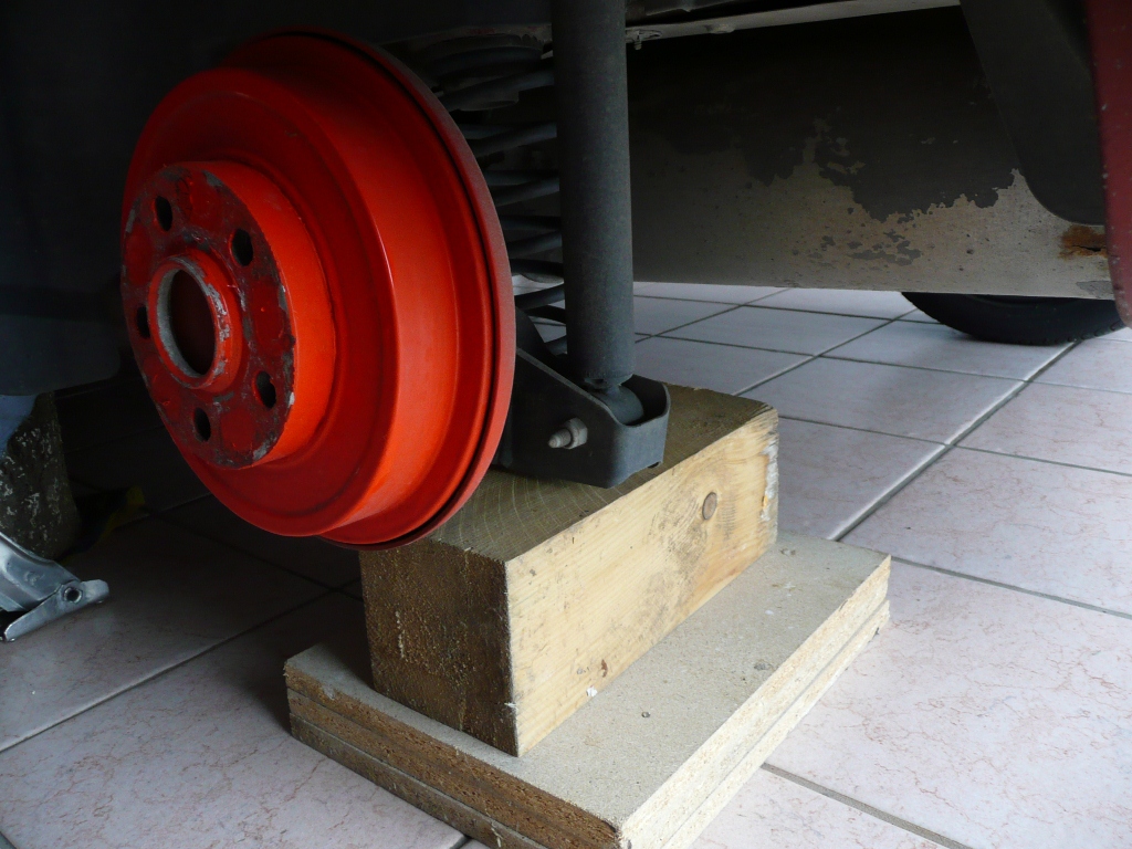 Podložíme si nápravu pod tlmičom, aby nám veľmi neklesla. Ťažšie sa potom zhadzuje tlmič….