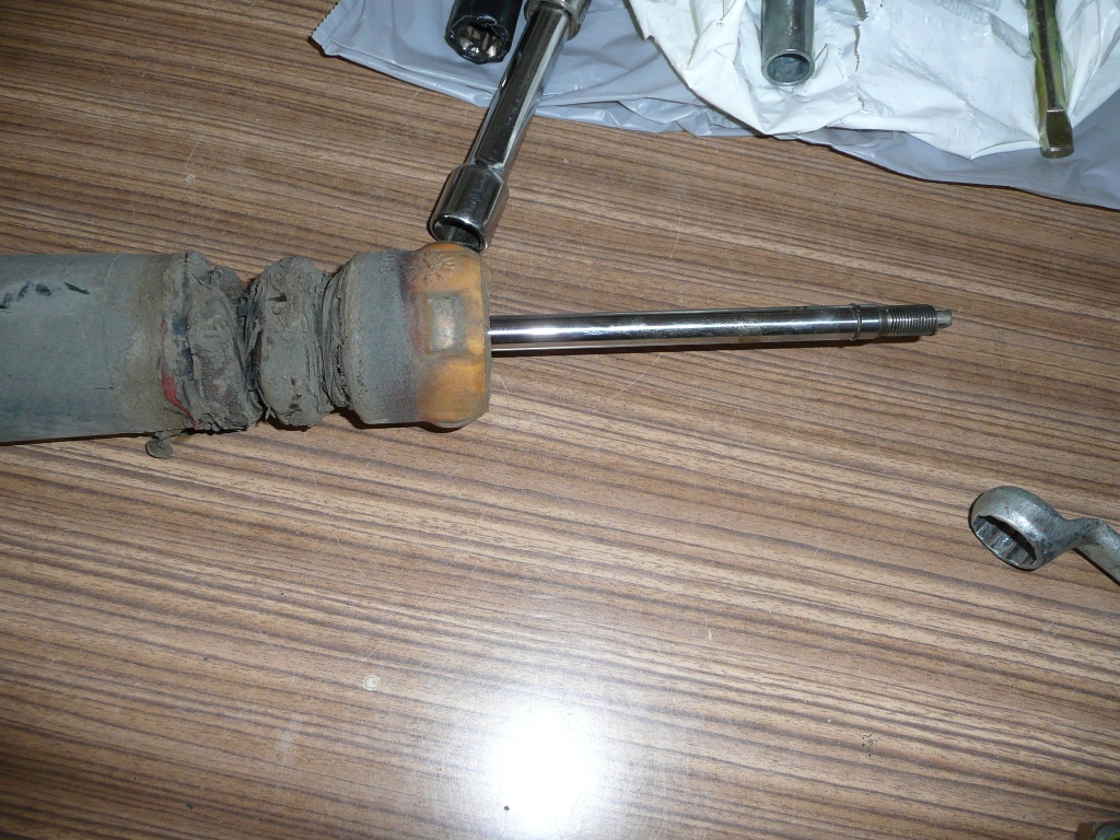 Povolíme kľúčom 17 maticu tlmiča, ak sa točí tyčka tlmiča prichytíme 5,5 až 6 kľúčikom hriadeľ….