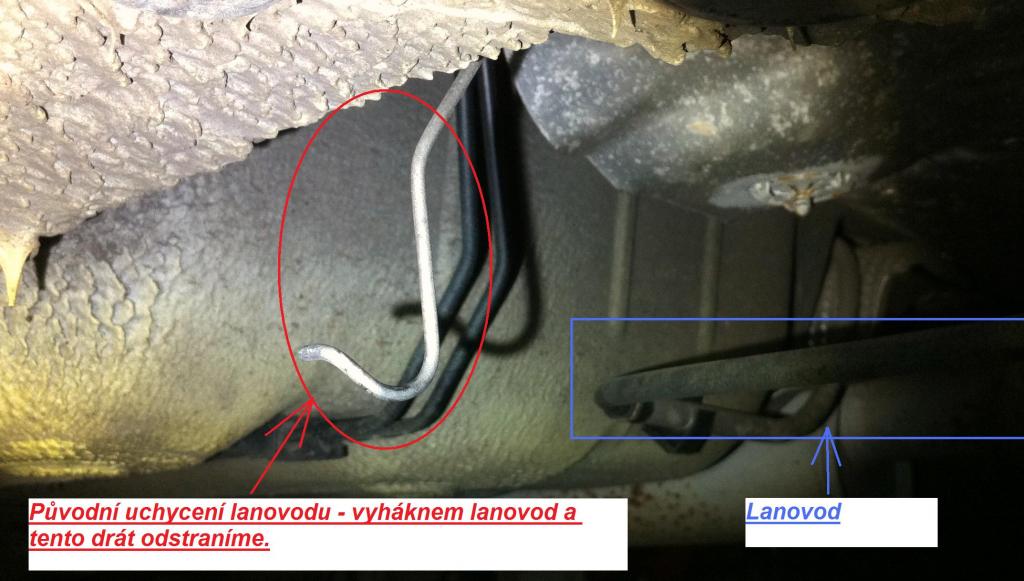 Uchycení, které je přes silný drát na karoserii se odstraní ( vyhákne z karoserie ). Jen přidržuje lanovod, aby nevysel pod vozidlem.