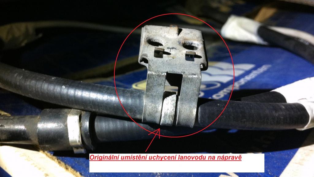 Další uchycení lanovodu je přímo na nápravě. Zde drží pres kovovou přezku na nápravě.