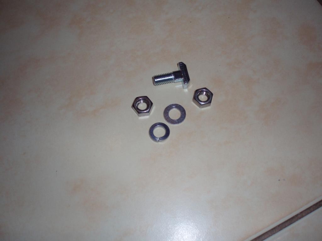 Do zadní díry našroubuje ten upravený kladivový šroub + obyč. podložka a matka. Našroubovat co nejvíce dopředu – proto je to jedno osazení úplně upilované aby šel dát úplně nakraj té díry.