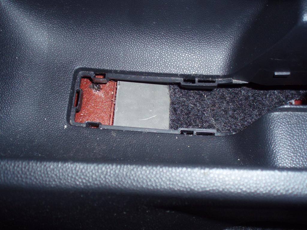 Přiložíme plech na místo kde bude přibližně ležet (je posunutý o cca 5mm dopředu oproti tomu, jak tam má být ve F2 – proto jsou ty díry, tam kde byly ty šrouby pro ručku, oválné) a nařízneme koberec: