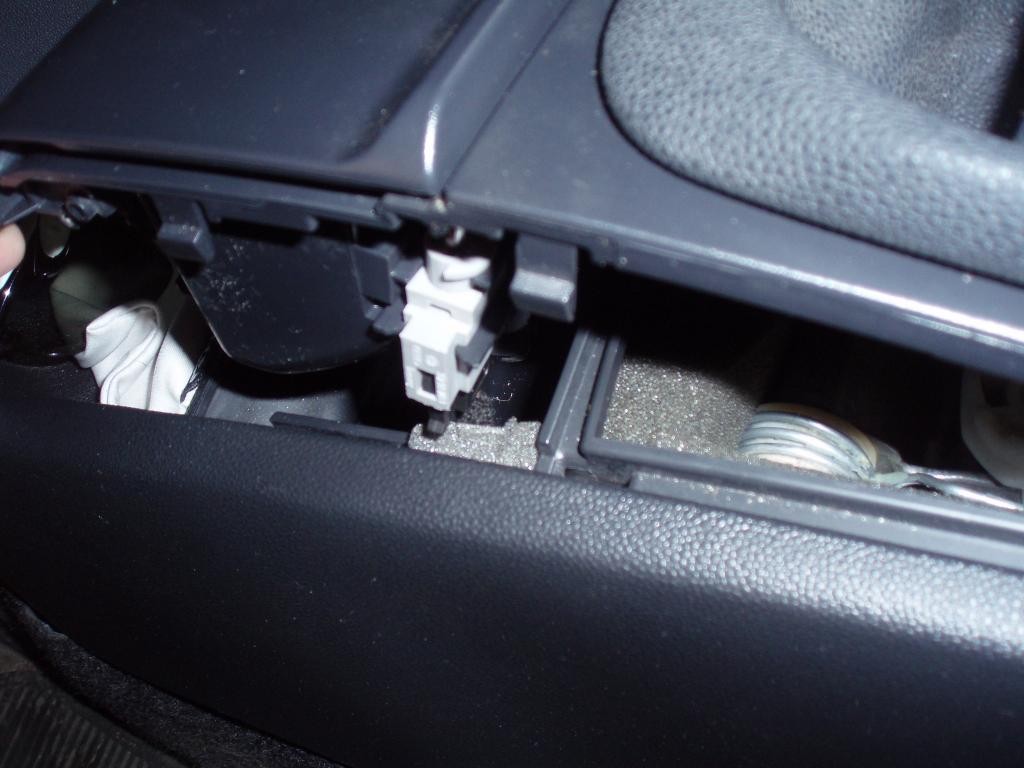 Rámeček pak vyskočí ze západek a opatrně ho vyndáme (západek je celkem 6) Nezapomeneme rozpojit svorkovnici od světýlka osvěcující přední popelník: