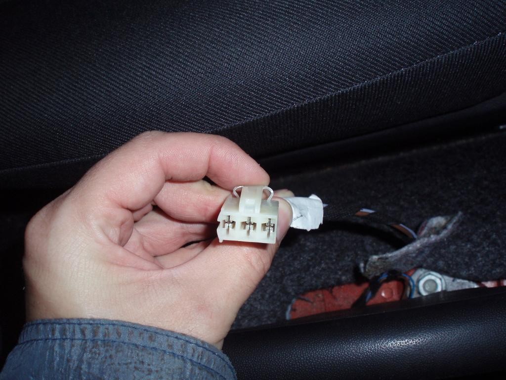 Nyní můžeme začít odzadu zvedat tunel. Posuneme si spolujezdcovu sedačku dopředu a rozpojíme svorkovnici pro zásuvku. Moc se tam koukat nedá, je to spíš popaměti. Svorkovnice s pojistkou vypadá takto:
