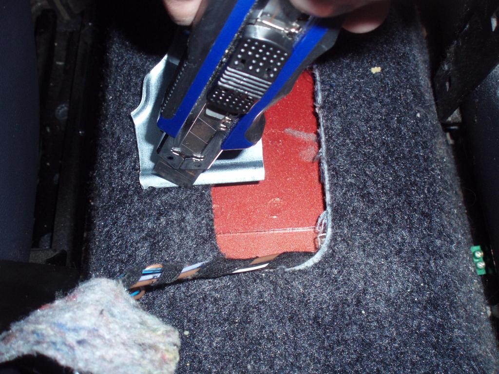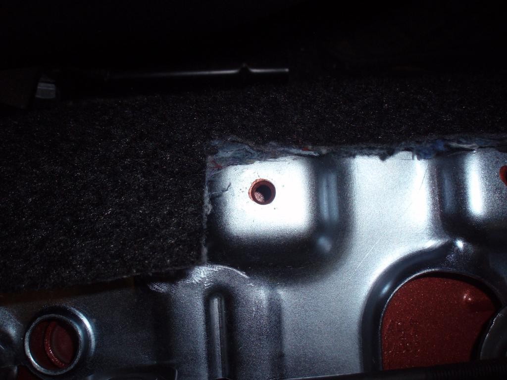 Musí se trochu vyřezat koberec, aby nevadil pak té noze a také, a to je důležité!! ten plech je při výrobě nalakovaný tudíž je potřeba závity potřít barvou – já použil korekční tužku s mojí barvou, jinak tam ty šrouby skoro nedrží: