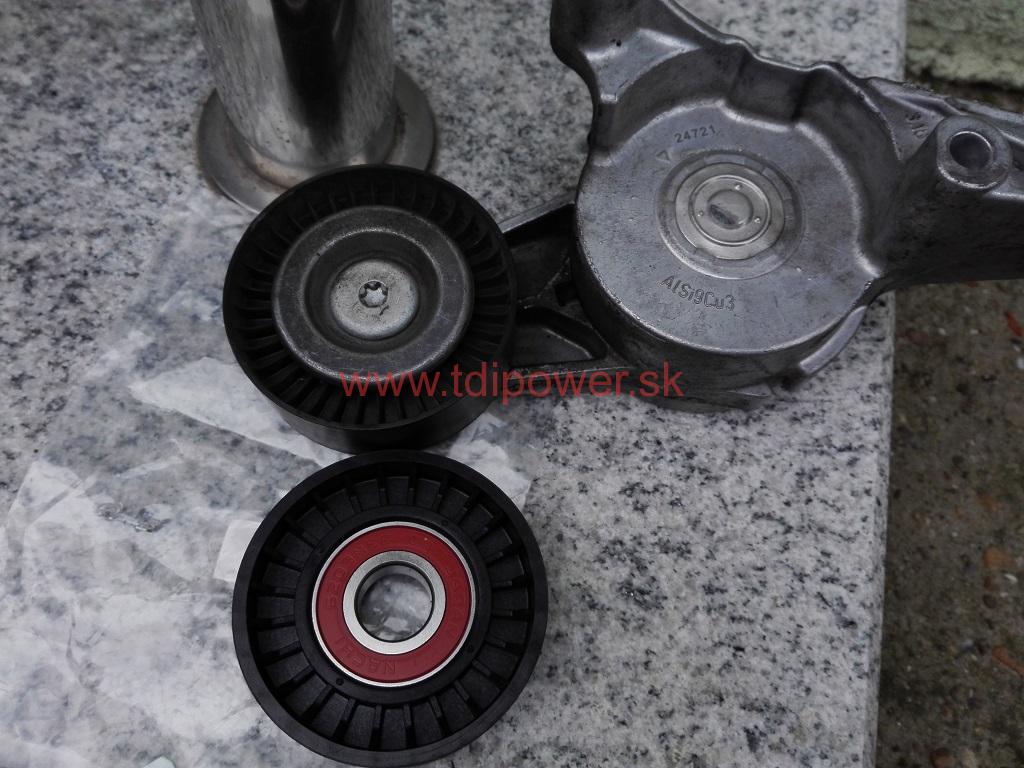 Po začatí demontovania okolitých častí motora si mechanik všimol ťažší – skákavý chod napínacej kladky ozubeného remeňa alternátora. Počkali teda s opravou a objednali po mojom schválení aj toto koliesko kladky ak by ten zvuk spôsobovalo ložisko kladky. Po výmene kolieska ten pískavý zvuk zmizol a motor si priadol ako zamlada.